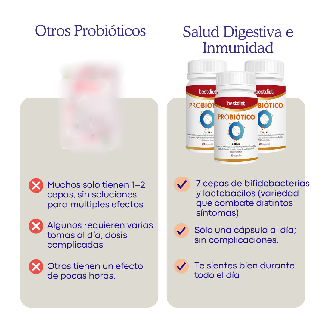 7 cepas probióticas cuidadosamente seleccionadas para aliviar la hinchazón, mejorar tu digestión y fortalecer tus defensas desde adentro.